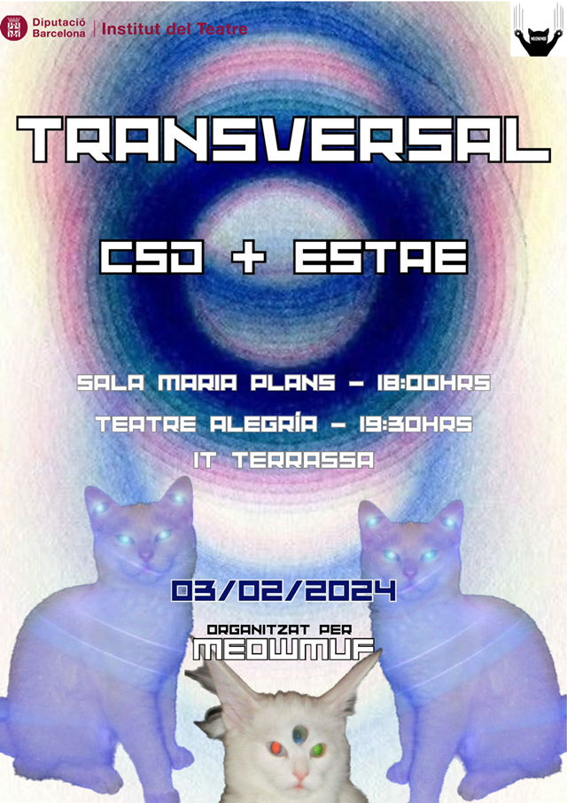 El col·lectiu d'alumnes Meowmuf de l’assignatura de Gestió aplicada del Conservatori Superior de Dansa (CSD) amb el suport de l'alumnat de primer curs de l'Escola Superior de Tècniques de les Arts de l’Espectacle (ESTAE), organitza el Transversal, on es presenten diverses peces coreogràfiques.
