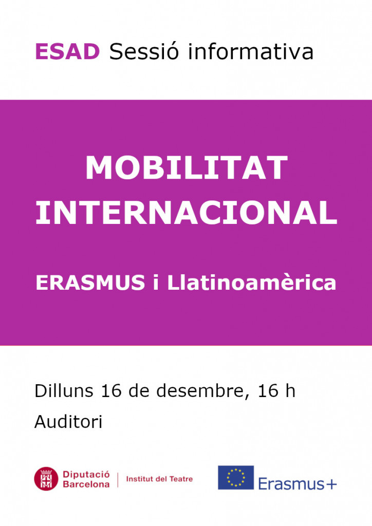 Xerrada a càrrec de Laura Conesa, responsable de les beques de mobilitat internacional (ERASMUS) per a estudiants, el dilluns 16 de desembre, a les 16:00h a l'Auditori.