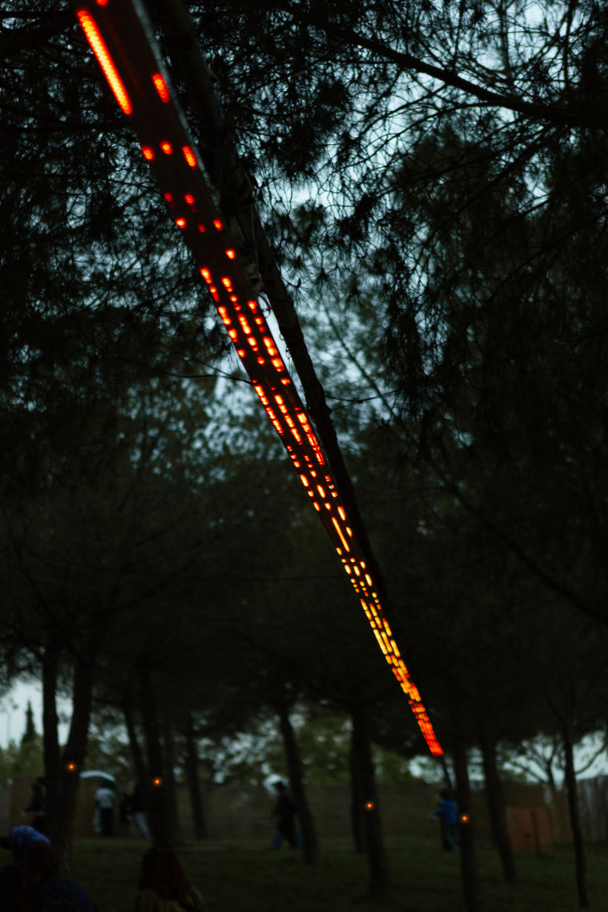 Flux és una interpretació del canal bidireccional per on circulen les dades vegetals. Una representació del codi que utilitzen per enviar-se missatges. Una successió de 26.880 punts de llum formen una línea flotant de 24 metres que visibilitza aquesta interacció entre espècies del món vegetal.