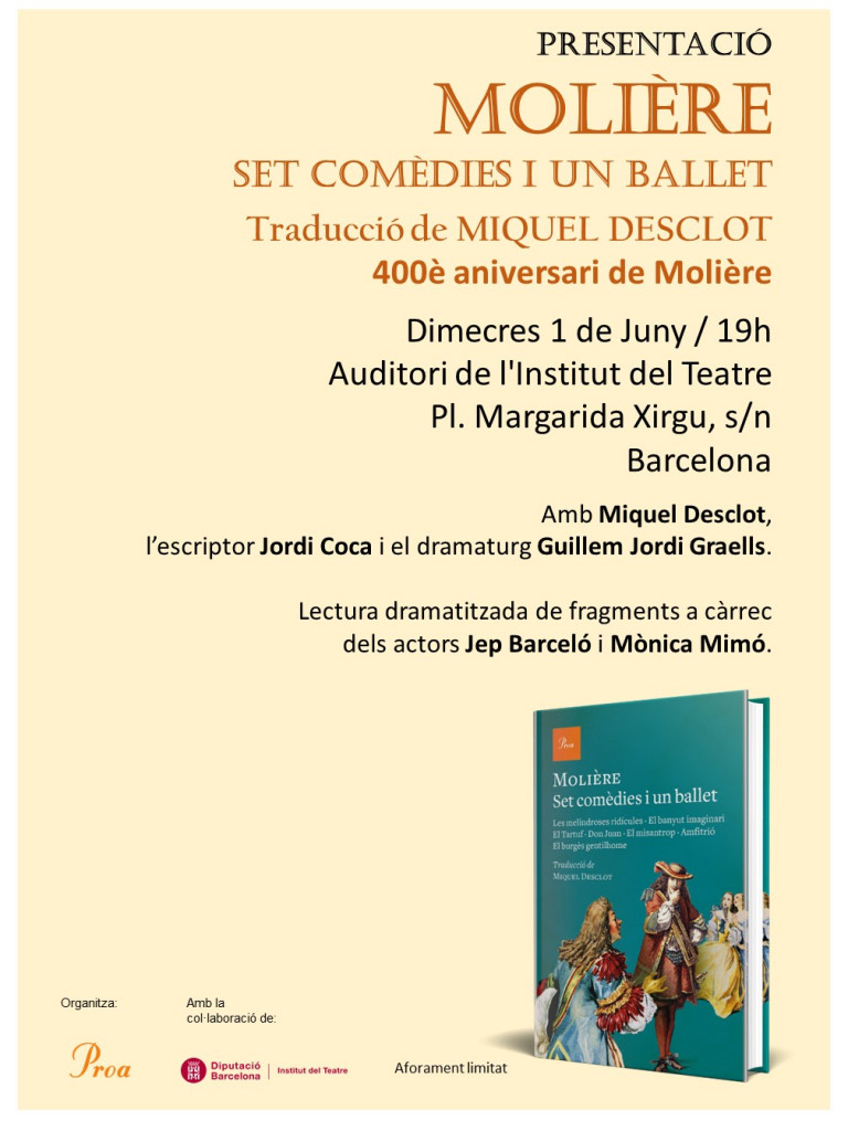 Presentació del volum Set comèdies i un ballet que reuneix diverses obres de Molière amb traducció de Miquel Desclot. El llibre, editat per Proa, es presenta coincidint amb l’any del quart centenari del naixement del dramaturg francès, i comptarà amb la participació dels escriptors Miquel Desclot, Jordi Coca i Guillem Jordi Graells.