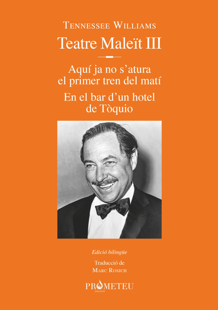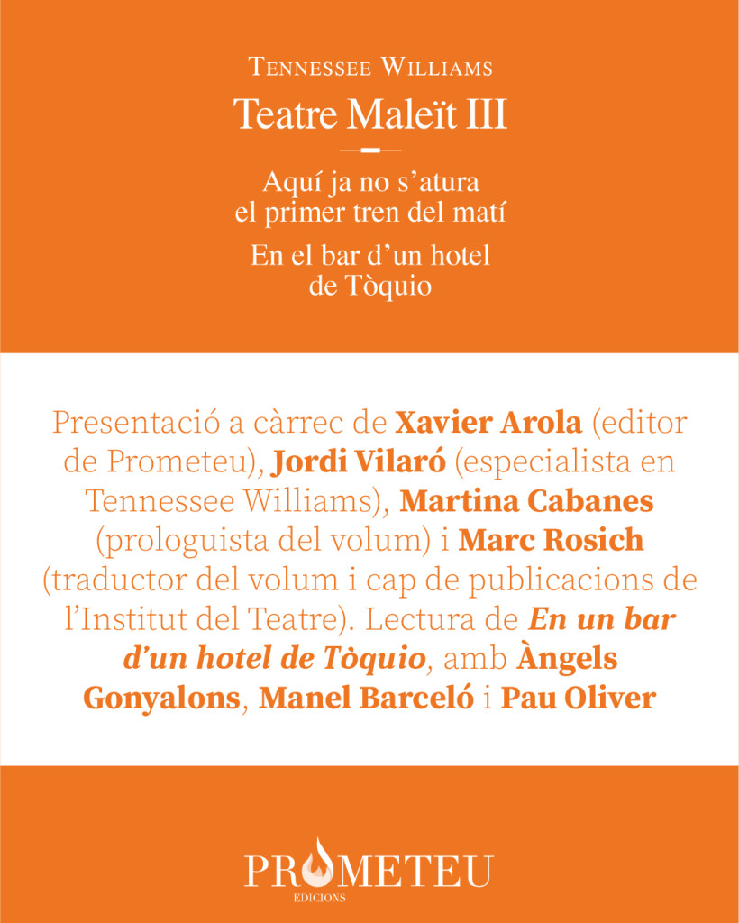 Prometeu Edicions i l’Institut del Teatre presenten el tercer volum del «Teatre maleït» de Tennessee Williams, que inclou les obres «Aquí ja no s’atura el primer tren del matí» i «En un bar d’un hotel de Tòquio», traduïdes al català per Marc Rosich. Les obres apareixen publicades en edició bilingüe anglès – català.