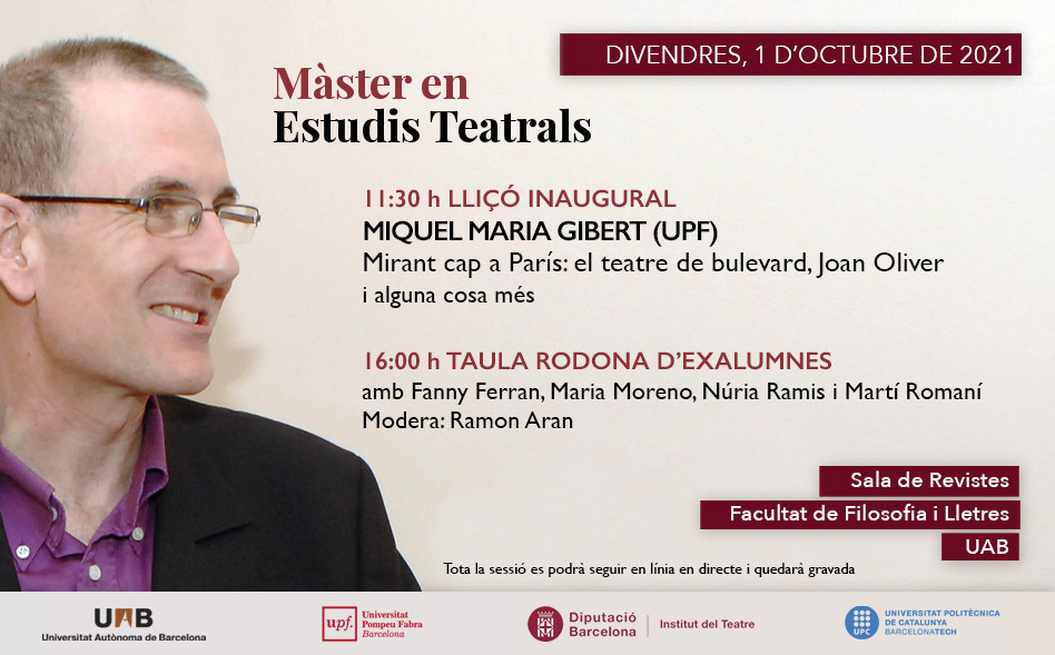 Lliçó inaugural del curs 2021-2002 del Màster Interuniversitari en Estudis Teatrals (MUET) a càrrec del doctor Miquel Maria Gibert (Universitat Pompeu Fabra) amb el títol: Mirant cap a París: Joan Oliver, el teatre de bulevard i alguna cosa més
