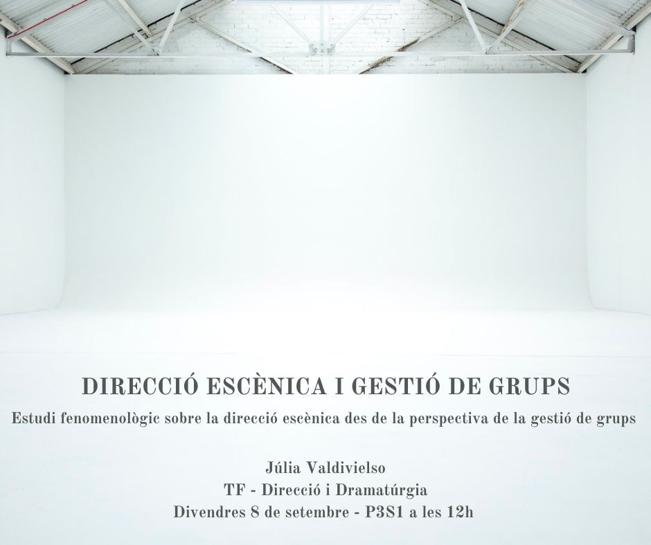 Treball final (modalitat teòrica) de l'alumna de Direcció i Dramatúrgia de l'ESAD, Júlia Garcia Valdivielso: Direcció escènica i gestió de grups. Estudi fenomenològic sobre la direcció escènica des de la perspectiva de la gestió de grups.