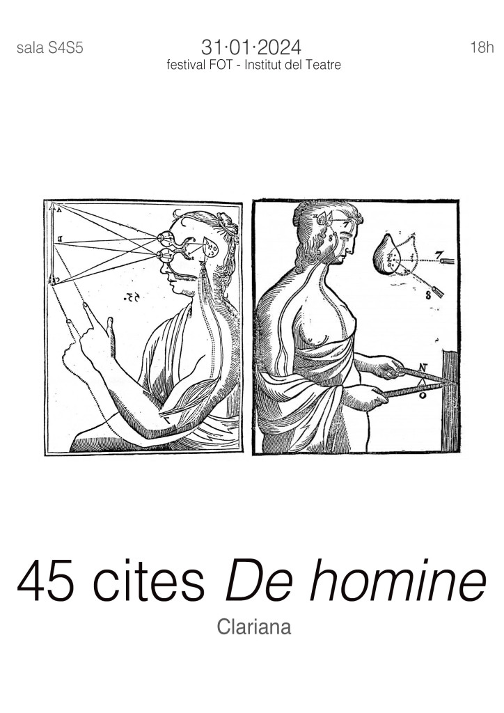 45 cites De homine és un retrat cru sobre l'explotació, mecanització i alienació del cos modern legitimitat per les teories de Descartes i Hobbes. La performance s'acciona per un cos que fa palès el desgast del cos màquina i la fal·làcia de què el cos s'aliena a les altres màquines de producció. Emmarca una lluita d'un cos controlat i determinat a fracassar en la seva lluita per la seva condició.