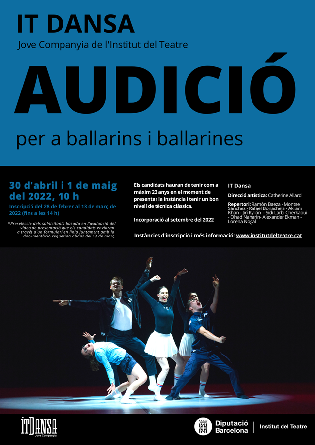 La jove companyia de dansa de l'Institut del Teatre IT Dansa convoca la seva audició anual els dies 30 d’abril i 1 de maig per a seleccionar ballarins i ballarines que vulguin formar part d’aquest postgrau de perfeccionament a partir de setembre de 2022. La selecció es durà a terme en dues fases. Les sol·licituds es podran presentar des del 28 de febrer al 14 de març.