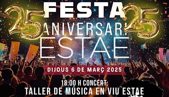 L’Escola Superior de Tècniques de les Arts de l’Espectacle (ESTAE) celebra el proper dijous 6 de març una festa al Teatre Alegria de Terrassa per commemorar els 25 anys de l’escola. En el marc de la celebració es farà un doble concert de música en viu, un sopar de germanor i l’actuació final de diversos discjòquei que posaran el punt i final a l’esdeveniment.