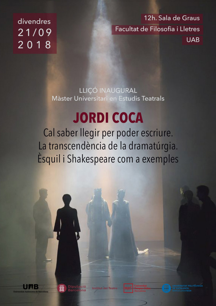 La lliçó inaugural del curs 2018-2019 anirà a càrrec de Jordi Coca, escriptor i doctor en Arts Escèniques per la UAB, el proper 21 de setembre a les 12h a la Sala de Graus de la Facultat de Filosofia i Lletres de la UAB.