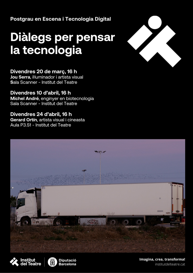 Els "Diàlegs per pensar la tecnologia” del postgrau són gratuïts i oberts al públic. Les xerrades es duran a terme a l’Institut del Teatre de 16 h a 20 h, en divendres. La primera i segona sessió tindran lloc a la sala Scanner, mentre que la tercera es farà a l’aula P3.S1.