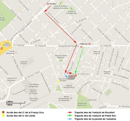 Accés de vehicles al recinte pel carrer França Xica, 19, alçada carrer Bòbila. Accés exclusiu per a vehicles autoritzats. Cal enviar sol·licitud prèvia d'accés.