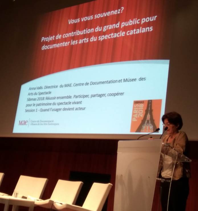 D’altra banda, la directora del MAE, Anna Valls, va participar del 5 al 8 de juny al 32è Congrés de la SIBMAS (Société internacionale des bibliothèques et musées des arts de spectacle), el qual va tenir lloc a París. En el marc del congrés, Valls va presentar la comunicació «Vous vous souvenez?” Un ambitieux projet de contribution du grand public pour documenter les arts du spectacle catalans», a través de la qual va explicar el projecte de catalogació social «Te'n recordes?» que es duu a terme al MAE per a la documentació de les imatges d’arxiu sobre arts escèniques. La SIBMAS és la Societat Internacional de Biblioteques i Museus d’Arts de l’espectacle, de la qual el MAE n’és membre.