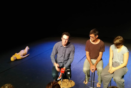Finalment, del 12 al 14 de novembre Carine Gualdaroni, de la companyia Juste Après ofereix el taller “El cos i el seu doble”. Aquesta companyia ha treballat durant els últims anys un llenguatge específic de manipulació de cossos i figures humanes, el “titella doble”, basat en l’exploració dels vincles entre el cos viu de l’intèrpret i el cos inert del doble. El laboratori plantejarà una introducció a les eines bàsiques d'aquest llenguatge.