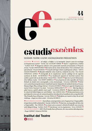 El dossier principal d'aquest número se centra en la complexitat de les relacions entre Teatre i Ciutat. En aquest sentit, recull les ponències i comunicacions presentades al simposi “Teatre i Ciutat: escenografies preexistents” que l’Institut del Teatre va organitzar l’octubre de 2018, on s’hi van estudiar els vincles entre teatre, arquitectura i societat i també es va reflexionar sobre la potencialitat dramatúrgica de la ciutat.
