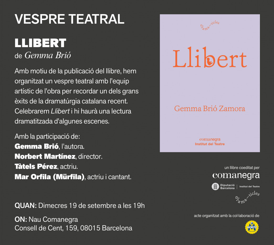Hi participaran Gemma Brió (autora), Norbert Martínez (director de Llibert), Tàtels Pérez (actriu de Llibert) i Mar Orfila (Mürfla, actriu i cantant de Llibert). Hi haurà una lectura dramatitzada d'algunes escenes.