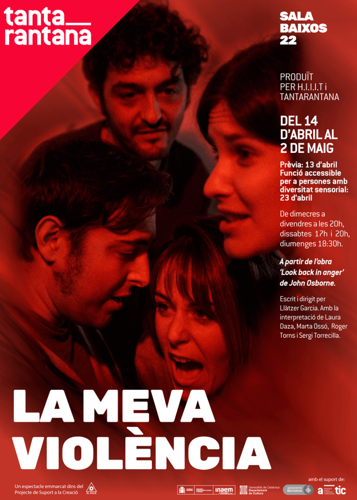 La meva violència és un text inspirat lliurement en l’obra de John Osborne Look back in anger, que a casa nostra es va conèixer amb el títol Amb la ràbia al cos. Es tracta d’un encàrrec que Produït per H.I.I.I.T ha fet al director i dramaturg Llàtzer Garcia. De l’obra original ens quedem el seu esperit, irat i inconformista, amb uns personatges que es neguen a ser hipòcrites, a viure com zombis, personatges que prefereixen patir perquè en el patiment es reconeixen com a humans. Produït per H.I.I.I.T, companyia integrada per Laura Daza i Roger Torns, ha decidit comptar aquest cop amb una visió externa per tal de poder submergir-se en un treball actoral hiperrealista, cru i acurat. Per això compten amb en Llàtzer Garcia, autor i director amic amb qui tenen afinitat i coincidències en la manera d’entendre el fet teatral i el treball en escena, i que en els seus muntatges busca aprofundir en l’ànima, els desitjos i les raons dels personatges.