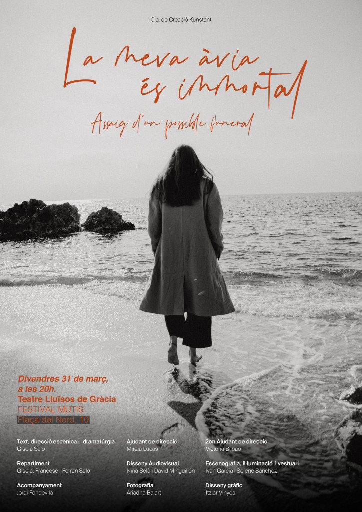 La meva àvia és immortal (assaig d'un possible funeral) és una peça íntima de teatre documental on, seguint l’estructura d’un concert en format assaig, la neta i els fills de la Teresa (la Babita) ens fan viatjar per la vida de l’àvia a través de les seves cançons preferides, les seves històries, els records de les cintes de vídeo 8, les infinites trucades de telèfon en temps de Covid... mentre es preparen per la seva mort des de l’humor i l’amor. Un funeral abans de temps transformat en peça escènica musical. Un espectacle permanentment viu i en constant transformació.
