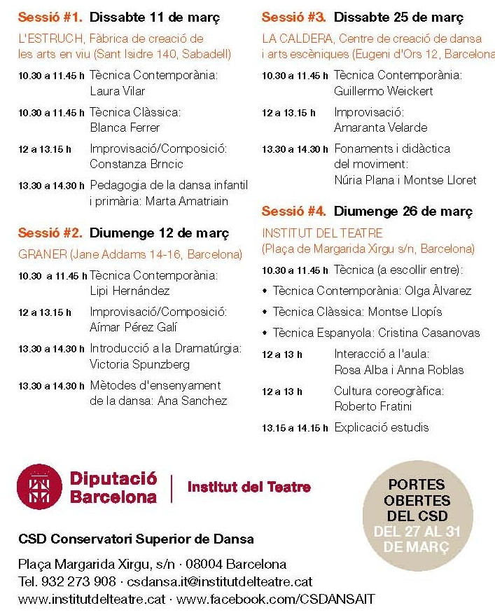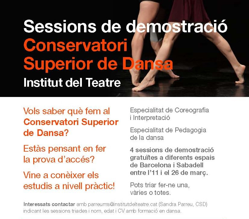 El Conservatori Superior de Dansa (CSD) de l'Institut del Teatre organitza una classe de demostració gratuïta adreçada a futurs estudiants dels ensenyaments del Títol Superior de Dansa. Aquesta iniciativa complementa les jornades de portes obertes del CSD, que tindran lloc del 27 al 31 de març.