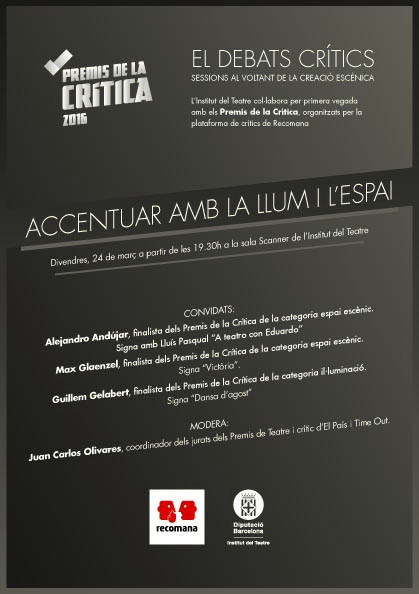 En el marc dels XIX Premis de la Crítica de les Arts Escèniques, l'Institut del Teatre acull un dels dos "Debats Crítics" previs al lliurament dels guardons, que tindrà lloc el proper 27 de març a l'Antiga Fàbrica Estrella Damm de Barcelona. El debat de l'IT, ACCENTUAR AMB LA LLUM I L’ESPAI, abordarà la relació entre escenografia i il·luminació, estarà moderat per Juan Carlos Olivares, coordinador dels jurats dels Premis de Teatre i crític d’El País i Time Out, i comptarà amb les intervencions de: