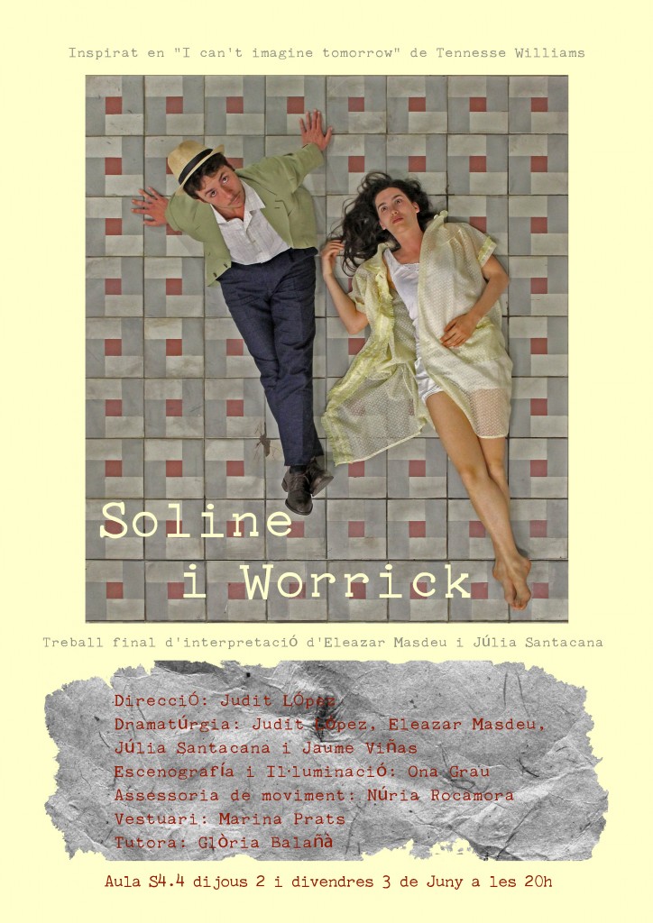 Els propers dijous 2 i divendres 3 de juny , Eleazar Masdeu i Júlia Santacana, alumnes de l'especialiat d'Interpretació de l'ESAD, presenten el seu treball final Soline i Worrick inspirat en I can't imagine tomorrow de Tennessee Williams.