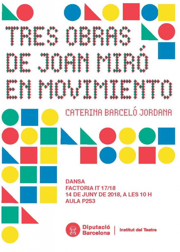 «Tres obras Joan Miró en movimiento» es un proyecto educativo de danza dirigido a niños y niñas de 9 a 12 años basado en la relación entre movimiento y tres obras pictóricas del artista: Personaje delante del sol (1968), La estrella matinal (1940) y La sonrisa de una lágrima (1973). Gracias a la participación de los alumnos de contemporáneo I de l’Escola Municipal de Musica i Dansa de Tiana se ha podido llevar a cabo una aplicación práctica, la creación de un material educativo basado en contenidos de movimiento de Rudolf von Laban y la evaluación del repertorio corporal antes y después de la intervención, así como la evaluación del conocimiento de las tres obras de Joan Miró.