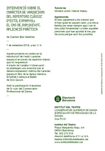 Treball de fi de grau de l'alumna Carmen Bas Martínez, de l'especialitat de Pedagogia de la Dansa al Conservatori Superior de Dansa (CSD). El títol del treball és «Intervenció sobre el caràcter de variacions del repertori clàssic d'estil espanyol: el cas de Don Quixost. Aplicació pràctica».