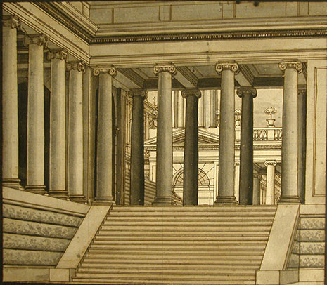 Fonts iconogràfiquesFig. 1 Giuseppe Lucini, Escalinata que porta a l’interior d’un temple, amb un pòrtic de columnes jòniques a l’entrada, técnica mixta, Museu de les Arts Escèniques de Barcelona, c. 1820. Topogràfic: escE 4.