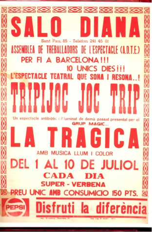 Produccions8 agost 1976. Tripijoc Joc Trip (melodrama en dos actes). Preestrena. Parc Municipal de Moià, Moianès. Estrena oficial: 6 octubre 1976, envelat de la Festa Major de Sarrià (Barcelona).